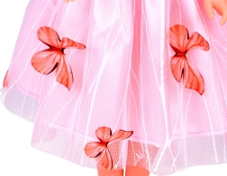 Ta očarljiva punčka bo postala zvesta spremljevalka za vsakodnevne igre in slavnostne priložnosti. Dolge, rahlo valovite lase je mogoče zlahka česati, krasiti in oblikovati, zato lahko vsak dan izgleda drugače. Rožnata obleka z nežnimi metuljčki in lahkotnim tilom punčki daje čaroben videz, ki takoj pritegne otroke.