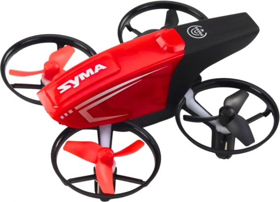 Nenavaden dron v rdeči barvi s štirimi propelerji.