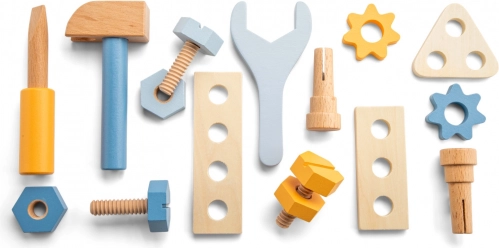 Vključuje 16 funkcionalnih delov: kladivo, izvijač, ključ, žeblje, vijake in zobnike za neskončne različice igre. Izdelek je iz FSC certificiranega lesa, zato podpira trajnostno izbiro za starše in planet.