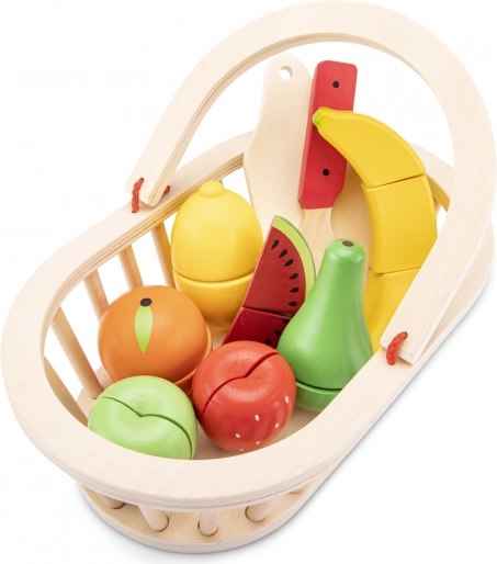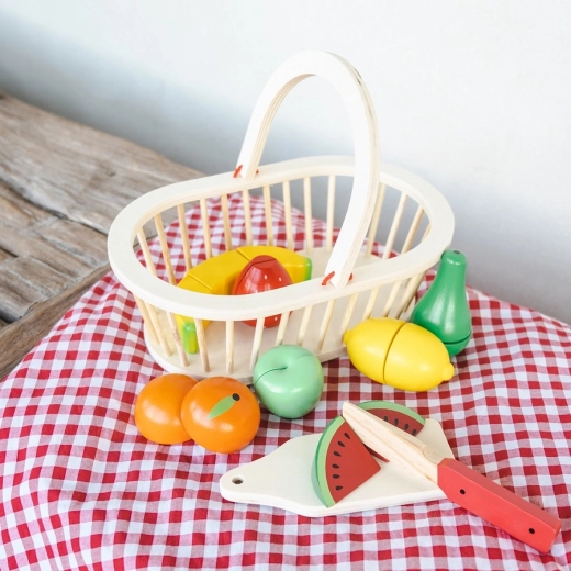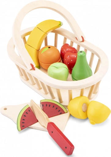 Del seta so deska, varen lesen nož in pester izbor sadja: lubenica, jagoda, hruška, jabolko, limona, banana in pomaranča. Vse je shranjeno v trdni leseni košarici, ki je odlična za preprosto shranjevanje in igro trgovine.