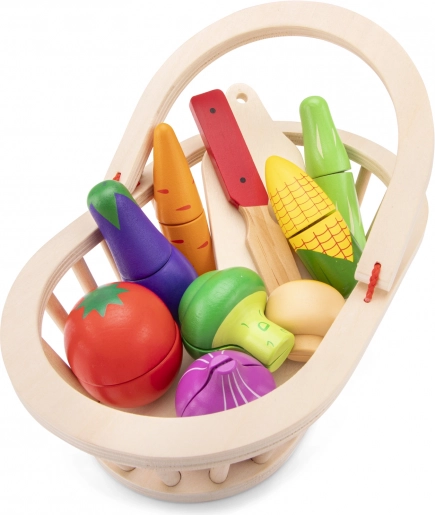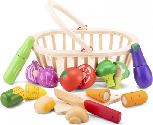 Komplet vsebuje košarico za enostavno shranjevanje in prenašanje, desko in lesen nož. Barvni kosi zelenjave – paradižnik, korenje, brokoli, jajčevec, čebula, koruza, gobe in kumara – vabijo k raziskovanju in učenju o zdravi prehrani.