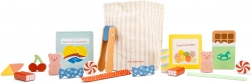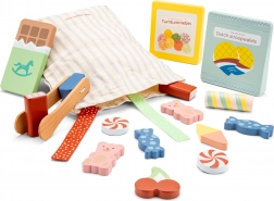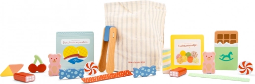 Ta leseni komplet slaščic bo razveselil vse male ljubitelje igre trgovine ali kavarne. V njem najdete pester izbor lesenih slaščic – od čokoladice do gumijastih medvedkov – ki so skrbno izdelane, da izgledajo kot prave. Del kompleta je tudi praktična bombažna vrečka za shranjevanje in lesene klešče za zabavno postrežbo.