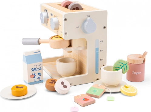 Priložen je bogat komplet pribora: 6 barvnih kavnih kapsul, 2 čajni vrečki, list mete, rezina limone, sladkornica, vrček za mleko in 2 skodelici s krožničkoma. Igra s kavnim aparatom podpira koordinacijo oko–roka, učenje skozi igro in razvoj samostojnosti.