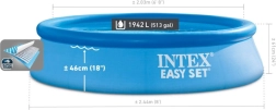 Uživajte v poletju z družinskim bazenom Intex Easy Set 244 × 61 cm, ki se ponaša z hitro montažo v 10 minutah, odpornim 3-slojnim PVC in priloženo filtrirno črpalko. Odlična izbira za vrt, kjer boste cenili preprosto vzdrževanje in stabilno konstrukcijo z volumnom vode do 1.942 l.