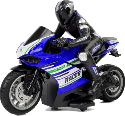 Podrobna izvedba motorja z voznikom, športnimi nalepkami in delujočimi kolesi za avtentično izkušnjo vožnje.