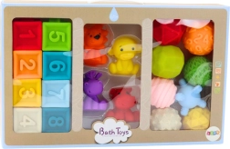 Mehke izobraževalne kocke za kopel predstavljajo inovativen set, ki vsebuje 20 pisanih gumijastih delov. Vsaka od osmih kock je edinstvena po svojih lastnostih, ki pomagajo razvijati kognitivne spretnosti otrok. Z različnimi oblikami in reliefi se kocke povezujejo v široko paleto konstrukcij, kar na zabaven način uri ročne spretnosti in koordinacijo oko–roka.