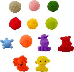 Set vsebuje različne oblike, živali in barvite teksture, ki spodbujajo senzorični razvoj pri otrocih.