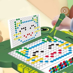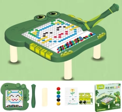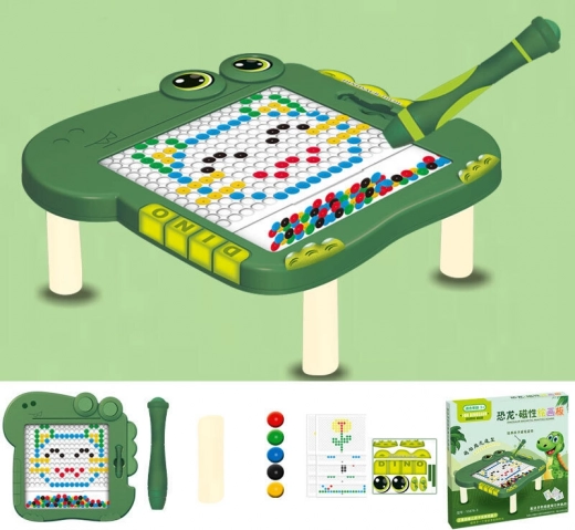 Odkrijte magnetno tablo, ki učenje spremeni v igro. Zahvaljujoč prozornemu okencu z barvnimi kroglicami (črne, zelene, modre, rdeče in rumene) ter magnetnemu risalu otroci zlahka sestavljajo vzorce, črke ali preproste slike. Zeleni dinozavrski dizajn takoj osvoji male ustvarjalce.