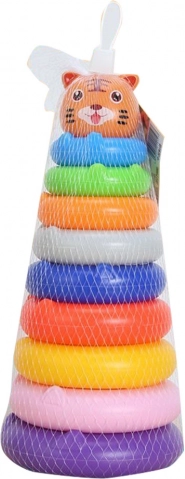 Zabavna in izobraževalna zložljiva piramida z obročki različnih velikosti in barv, dopolnjena s simpatičnim tigrom na vrhu. Spodbuja fino motoriko, koordinacijo oko–roka ter učenje barv, oblik in velikosti. Vključuje nalepke živali za ustvarjalno personalizacijo.