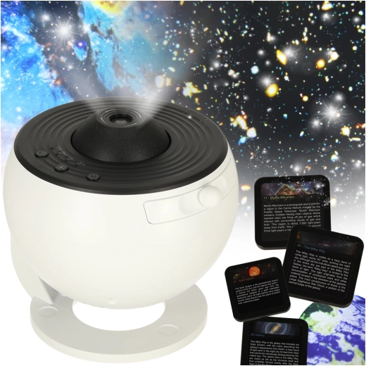V paketu je 12 izmenljivih diskov z opisi v angleščini – na primer Zemlja, Osončje, Rimska cesta in Luna. Zato projektor odlično služi za učenje skozi igro ter prebuja zanimanje za astronomijo pri otrocih in odraslih.