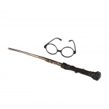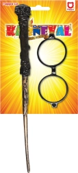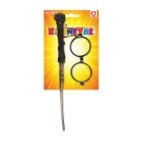Ta čarovniški komplet vključuje modna okrogla očala in avtentično plastično paličico, dolgo približno 40 cm. Oboje prispeva k prepričljivemu čarovniškemu kostumu.