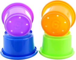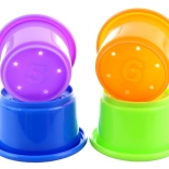 Štirje lončki s številkami in odprtinami so idealni za gradnjo stolpov, učenje štetja in igro z vodo. Vadijo prijem, logiko in koordinacijo.