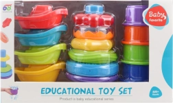 Odkrijte zabaven izobraževalni komplet 3-v-1 za najmlajše od 6 mesecev dalje. Vključuje pisane ladjice za v vodo, zložljivo piramido z obročki in štiri zložljive lončke. Igrače iz obstojne plastike razvijajo fino motoriko, koordinacijo oko–roka, zaznavanje barv in oblik ter prinašajo veliko zabave doma in v kadi.