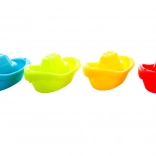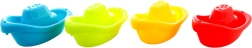 Štiri plavajoče ladjice v živih barvah popestrijo kopanje. Odprtine omogočajo zajemanje in prelivanje vode, kar spodbuja koordinacijo in radovedno raziskovanje.