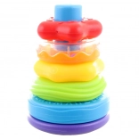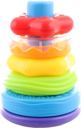 Barvni obročki različnih velikosti učijo razlikovati oblike in barve, razvijajo fino motoriko in potrpežljivost pri zlaganju na palico.