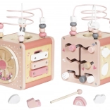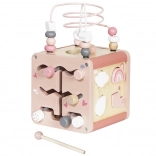 Lesena večfunkcijska kocka ponuja številne privlačne aktivnosti, ki bodo zagotovo pritegnile in razveselile otroka. Vsak element je skrbno zasnovan za enostavno prijemanje in uporabo pri majhnih otrocih. Močna lesena konstrukcija zagotavlja dolgotrajno vzdržljivost, medtem ko nežna pastelna grafika spodbuja domišljijo in koncentracijo. Premikajoči se elementi na kocki razvijajo otrokove ročne spretnosti in veščine.