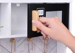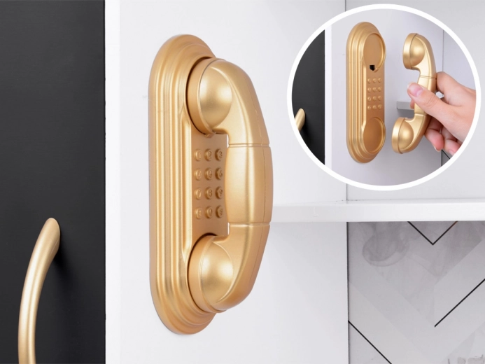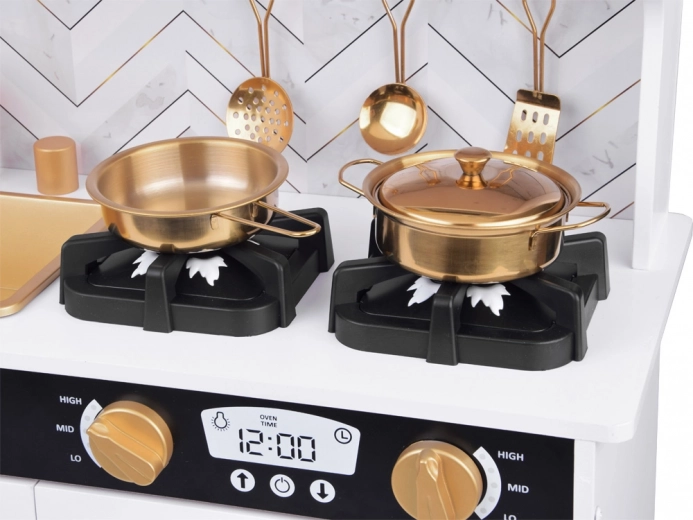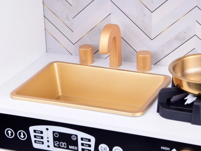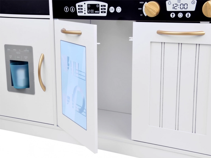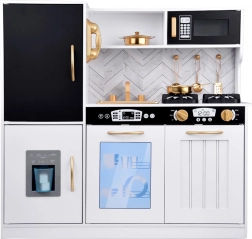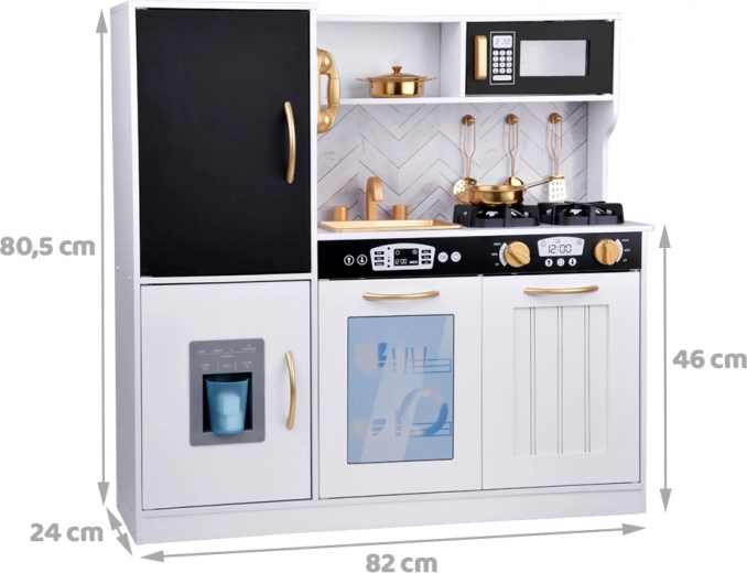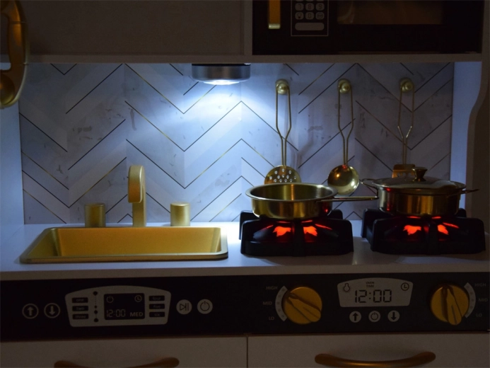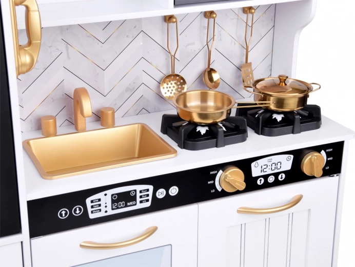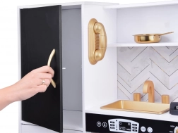 Vzbudite otrokovo zanimanje za kuhanje s to leseno kuhinjo, izdelano z veliko pozornosti do detajlov. Kuhinja ima pretežno bel dizajn s črnimi in zlatimi detajli, ki ji dajejo eleganco. Otroci lahko s kredo pišejo po tabli na hladilniku, posnemajo peko v pečici in pripravljajo jedi z realističnimi zvočnimi in svetlobnimi učinki.
