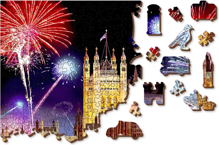 Dvostranska izvedba 2v1 prinaša dva izziva v enem: na sprednji strani sestavljate barvit motiv Londona z ognjemetom, na zadnji ponavljajoči se vzorec za sestavljanje po obliki. Tudi pri manjšem številu kosov je zaradi raznolikih oblik bolj zahtevno in zabavno. Puzzle so izdelane iz čvrste HDF-plošče (3–4 mm) in dobavljene v eko embalaži brez plastike s priloženo predlogo.