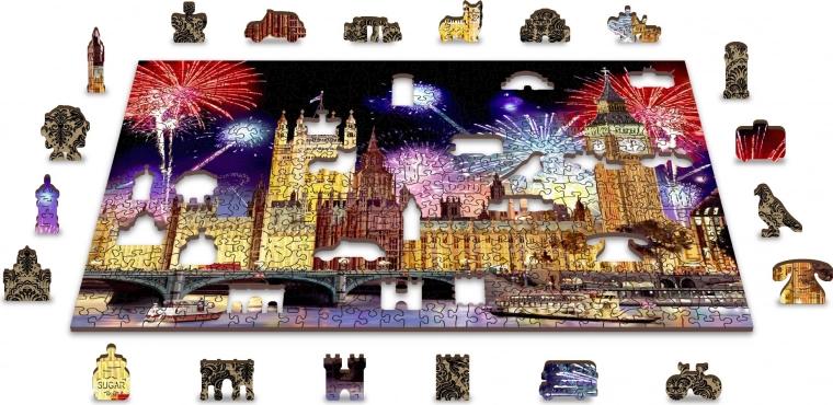 Vstopite v svet ikoničnih londonskih znamenitosti z lesenimi puzzli Nočni London znamke WOODEN CITY. Zahvaljujoč natančnemu laserskemu izrezu imajo kosi gladke robove brez trsk in se popolno prilegajo. Edinstveno oblikovani kosi – od živali do slavnih stavb – ustvarjajo med sestavljanjem nevsakdanjo izkušnjo, nekatere pa lahko postavite tudi kot drobne figurice.