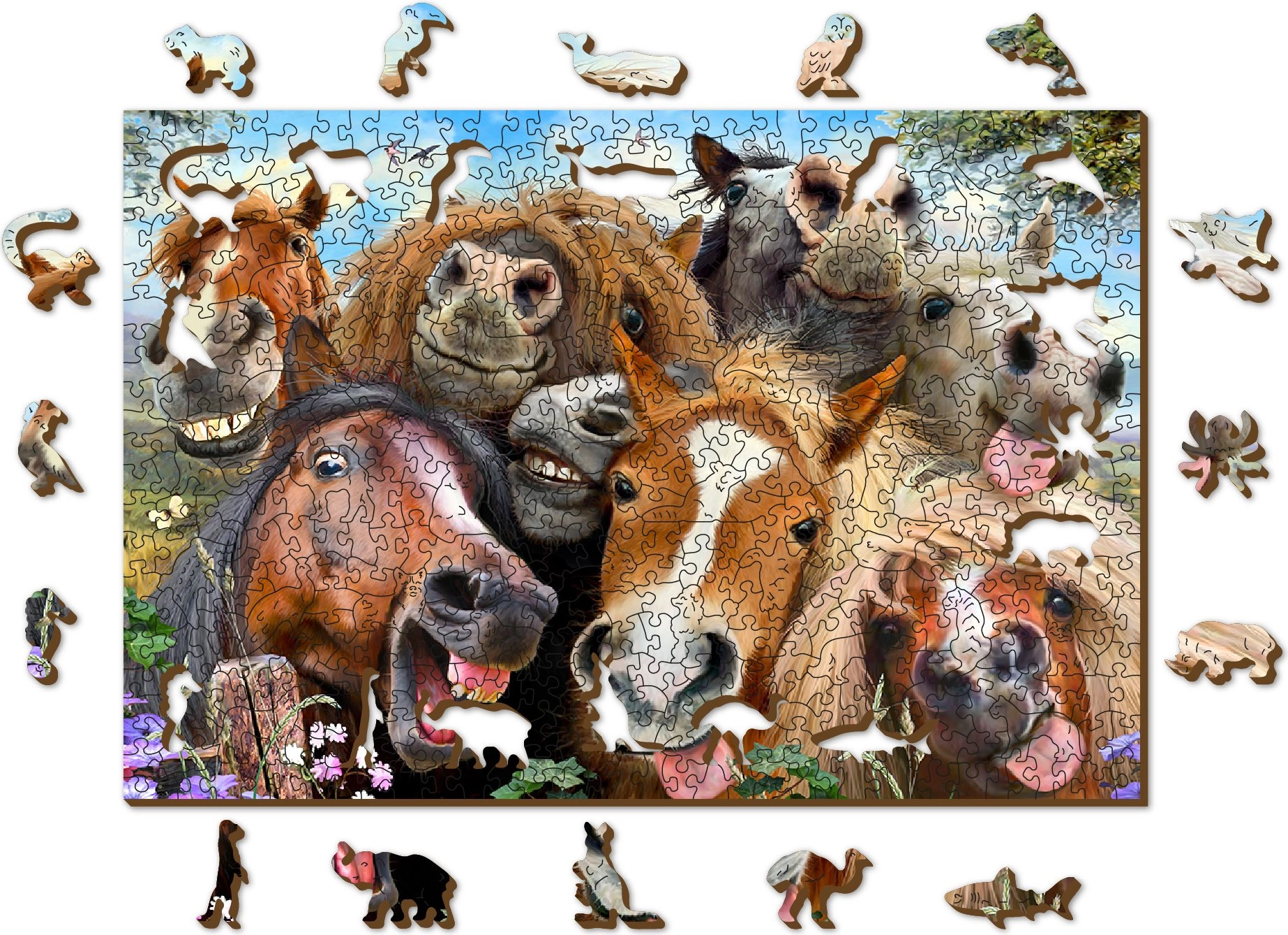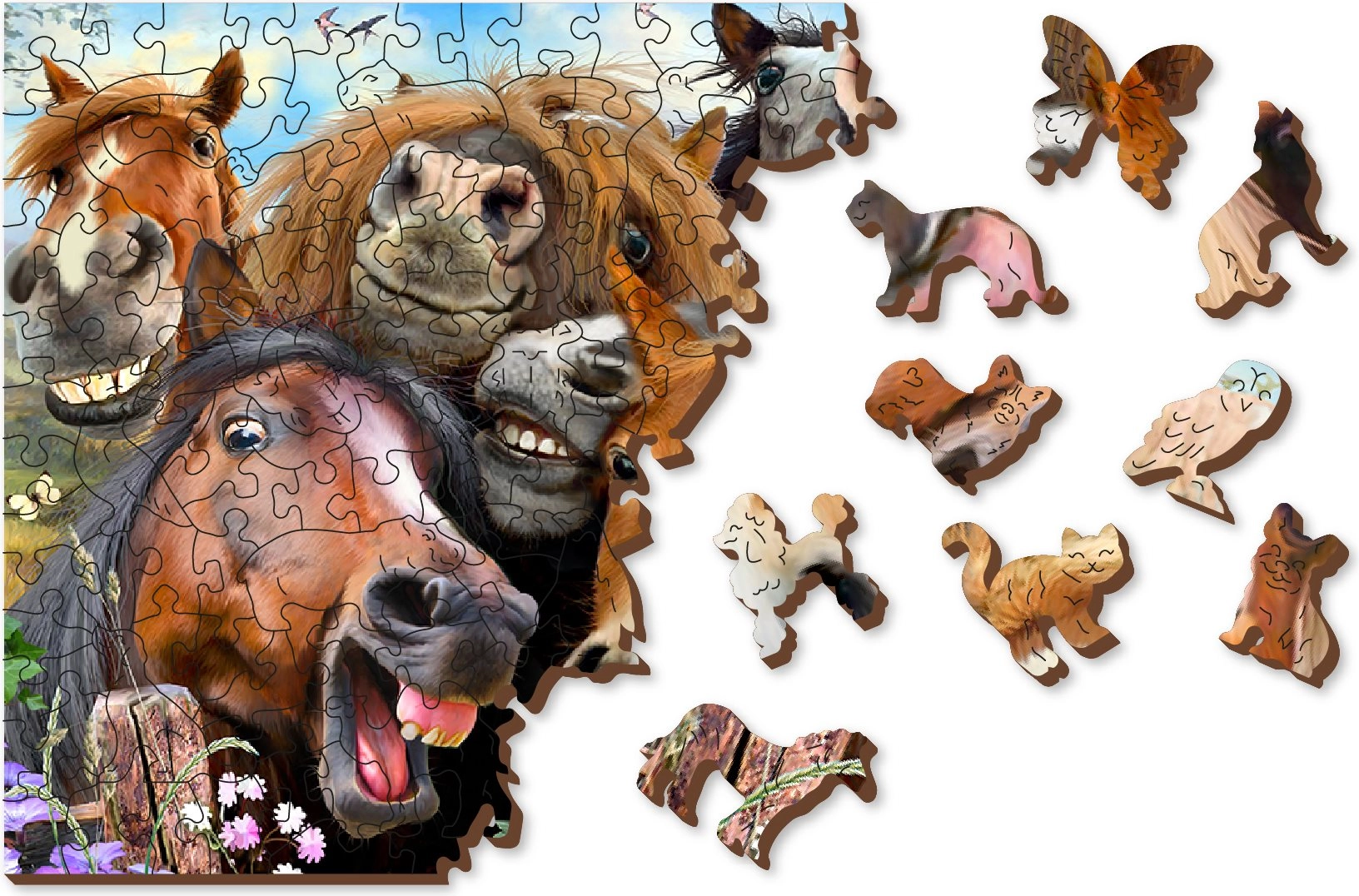 Stilska lesena sestavljanka WOODEN CITY »Konji vsepovsod« ponuja izvirno izvedbo z natančno lasersko poudarjenimi detajli. Del koščkov je v oblikah živali, zgradb in predmetov ter lahko samostojno stojijo kot majhne figurice. Zaradi raznolikih oblik nudi sestavljanje prijeten izziv tudi bolj izkušenim ljubiteljem sestavljank.