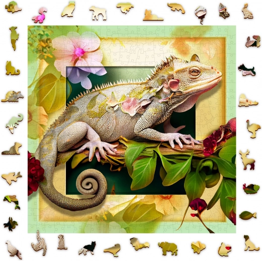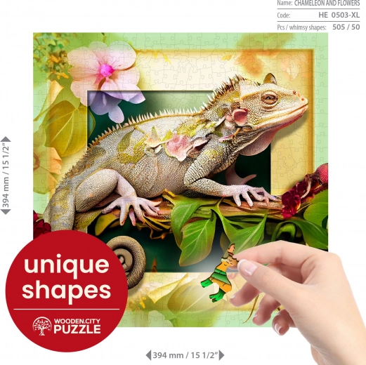 Lesene sestavljanke WOODEN CITY Kameleon in rože, 505 kosov. Dvostranska 2v1, laserska natančnost, posebne oblike, HDF 3–4 mm, eko embalaža brez plastike.