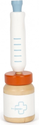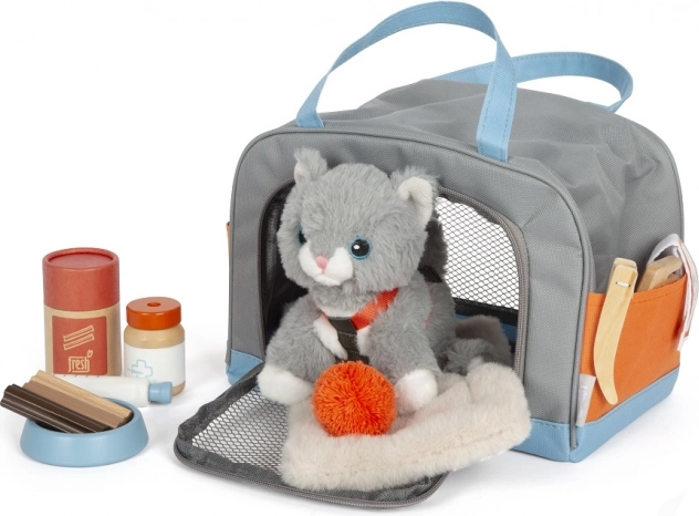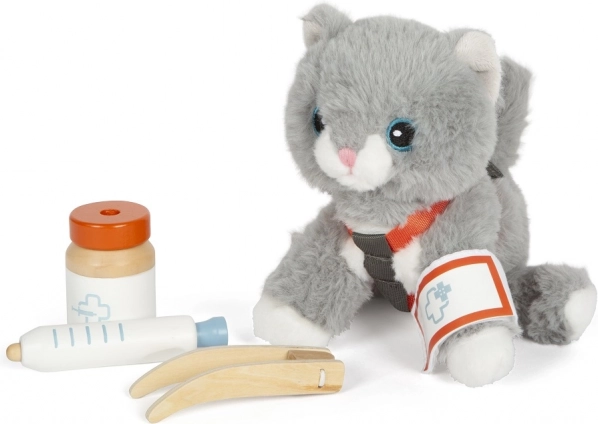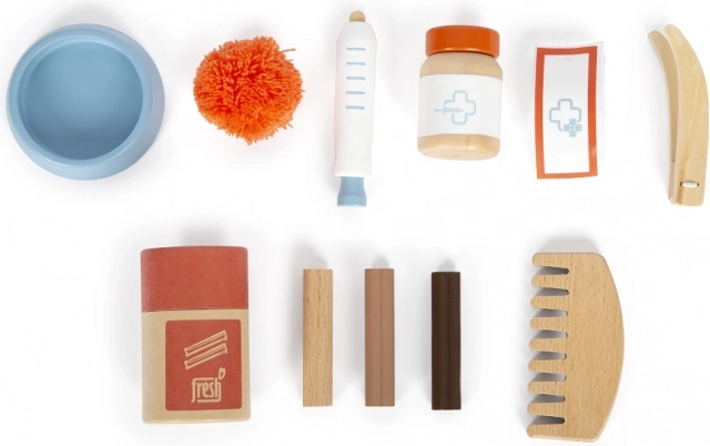 Lesena injekcija s vzmetnim mehanizmom, posodica za zdravila in drugi pripomočki podpirajo avtentično igro nege ljubljenčka.