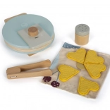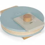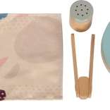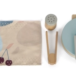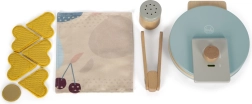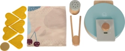 Del kompleta so tudi tekstilni prtiček, klešče za varno serviranje in sladkornica, ki ob posipanju oddaja prijeten ropotajoč zvok. Trpežna lesena izvedba v modernih barvah in prijetnih materialih je idealna za otroško kuhinjo.