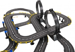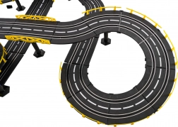. | - 2 dirkalna avtomobila, .- 2 daljinska upravljalnika, .- steza po delih, .- zapornice, .- napajalnik, . |