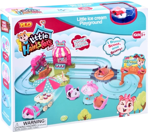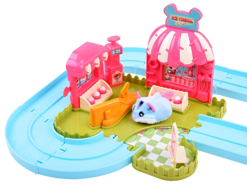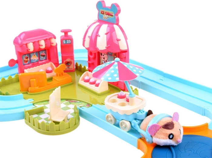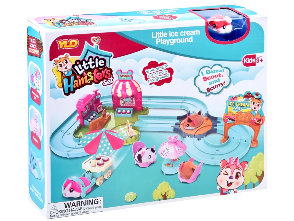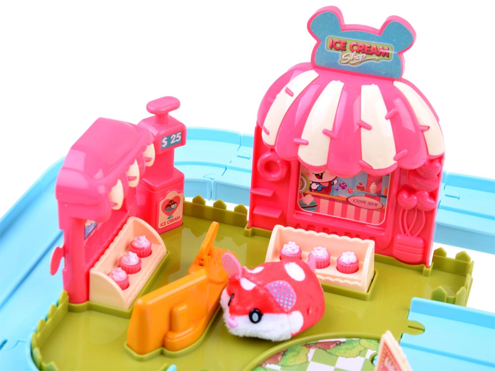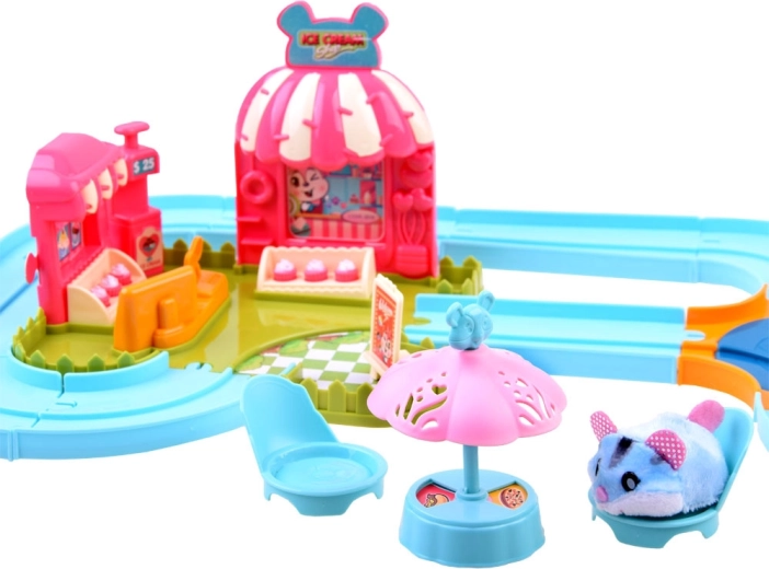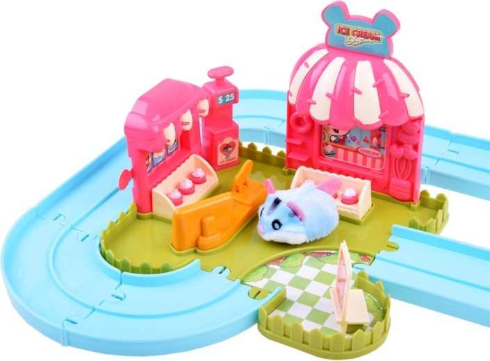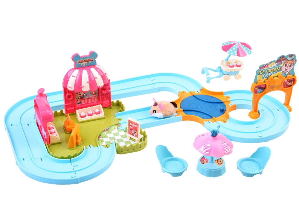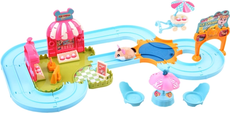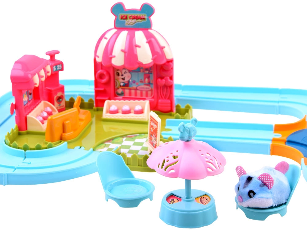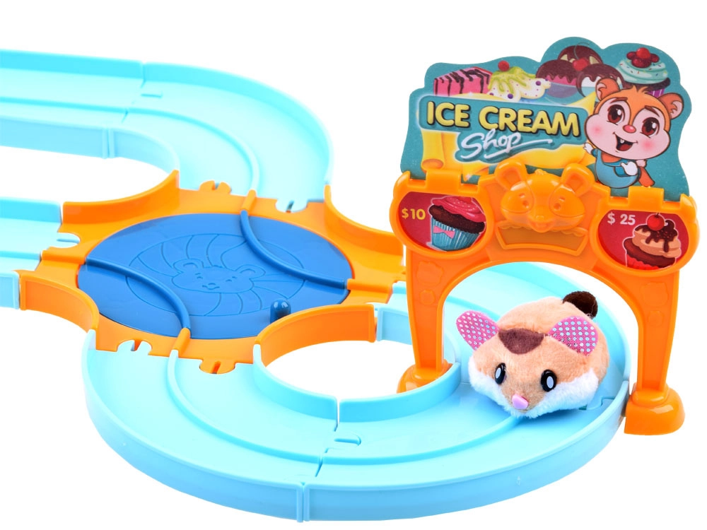 Ta igralni set prinaša zabaven svet sladoledarne s prikupnim hrčkom, ki ima mehak kožušček in je pripravljen na akcijo takoj po razpakiranju – napajanje z baterijo AG13 (vključena). Po vklopu se hrček zapodi, samodejno menja smer in ga je mogoče voditi po priloženi preprosto sestavljivi progi z izogibom. Z pritrjenim vozičkom razvaža dobrote za goste.