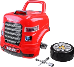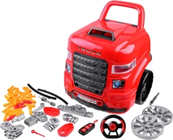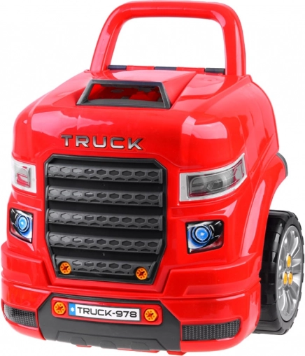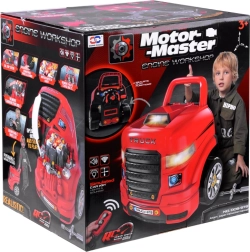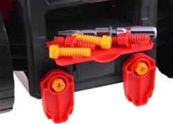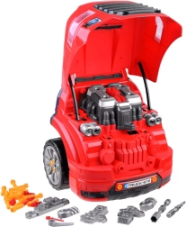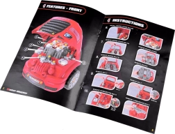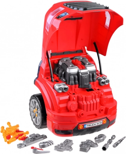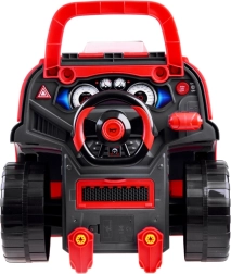 Ta prenosna avto-delavnica v rdeče-črni izvedbi vsakega otroka spremeni v spretnega mehanika. Pod pokrovom čaka podrobno izdelan plastični motor, ki ga je mogoče razstaviti in ponovno sestaviti. V kabini najdete volan s hupo, ročico z načini P/R/N, gumb start/stop in odlagalni prostor za drobnarije. Sprednje luči svetijo belo in jih spremljajo zvočni učinki.