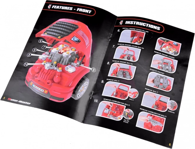 Pod pokrovom se skriva plastični motor s premičnimi deli. Otroci lahko privijajo, preverjajo olje in »servisirajo« svečke – idealno za učenje skozi igro.