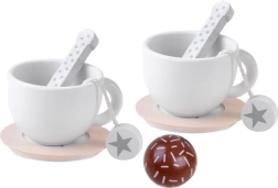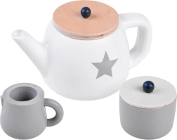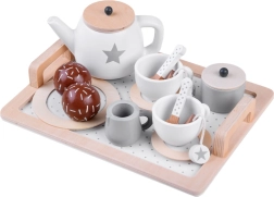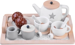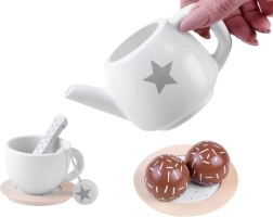 Vsi deli imajo nežne detajle – zvezdice in pike – ki setu dodajo čar. Otroci lahko “postrežejo” čaj, sladkor in mleko ter ponujajo lesene kolačke. Seta razvija fino motoriko, komunikacijo in kreativnost.