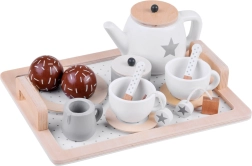 Priredite otroško čajanko z elegantnim setom na pladnju. Set je izdelan iz kakovostnega lesa in prebarvan z neškodljivimi barvami v modernih bež in belih odtenkih. Zahvaljujoč čvrsti konstrukciji in brezčasnemu dizajnu je idealen za igre vlog, posnemanje odraslih in skupne trenutke s prijatelji.