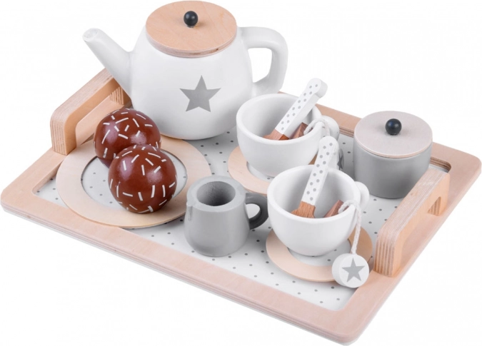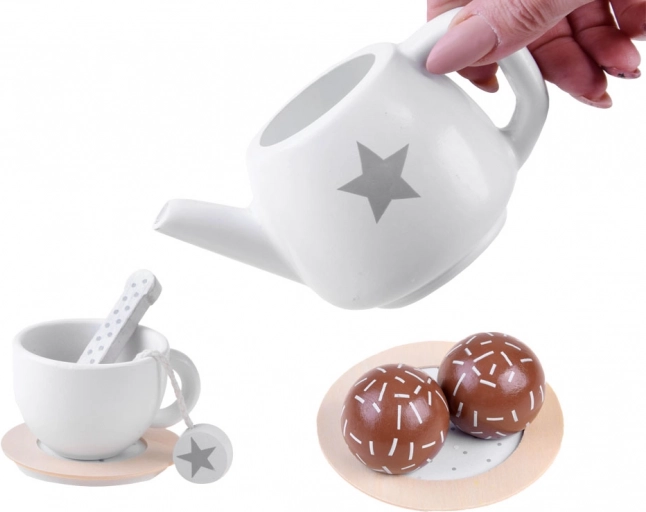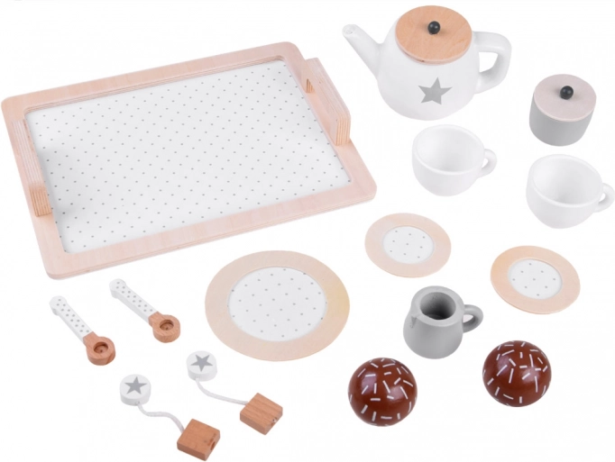 Stilski lesen čajni set v nežnih bež in belih tonih prinaša varno igro na čajanko. Vsebuje pladenj, čajnik, skodelice, krožničke, posodico za sladkor, vrček za mleko in lesene dobrote – vse z prisrčnimi motivi zvezdic in pik. Trpežna lesena izvedba, gladki robovi in netoksične barve spodbujajo domišljijo ter socialne veščine otrok.