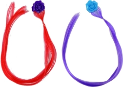 Del kompleta sta dva sintetična pramena s cvetličnimi sponkami – eden rdeč z vijolično vrtnico in drugi vijoličen z modro vrtnico.