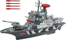 Odplujte na pustolovsko misijo s podrobno izdelano vojaško ladjo, ki otroke popelje v svet mornarice. Štirje upravljalni gumbi sprožajo različne kombinacije svetlobnih in zvočnih učinkov – šumenje morja, streljanje, alarm in glas kapitana v angleščini. Vrtljiv radar zasveti in igri doda pristnost, medtem ko pristajalna ploščad na krmi, sidro na premcu in premično orožje spodbujajo ustvarjanje lastnih bojnih scenarijev.