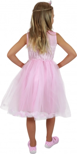 Rožnata princeskina obleka z motivom laboda vsako deklico spremeni v nežno pravljično junakinjo. Lahkoten til s cvetnimi listi daje krilu puhast videz, medtem ko satenasto spodnje krilo drži obliko in zagotavlja udobno nošenje. Zgornji del krasi eleganten motiv laboda, ki poudari čaroben dizajn.