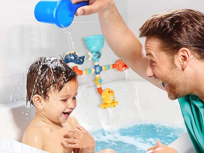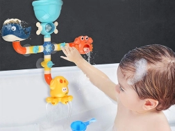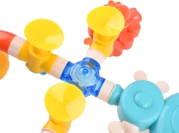 Ta interaktivni vodni set spremeni vsako kopel v igro. Vlijte vodo v zgornji lijak in opazujte, kako tok potuje skozi cevke, zavrti elemente in ustvari fontane in slapove. Dele z motivi hobotnice, kita in raka je mogoče preprosto premeščati in ustvarjati nove poti.