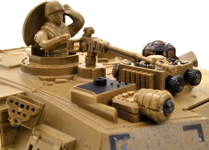 Sprednje LED luči, osvetlitev kupole in zadnji indikatorji ustvarjajo vzdušje nočnih operacij. Odprt pokrov sprejme priloženo figurico tankista.