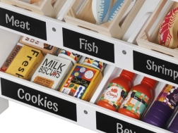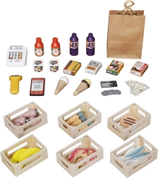 Set vsebuje blagajno s plačilnim terminalom, čitalnik, igralni denar, lesene gajbice z živili, papirnato vrečko, zvonec in dekorativne nalepke. Otroci osvojijo osnove računanja, finančne pismenosti in sodelovanja, hkrati pa vadijo pisanje in branje na krednih tablah.