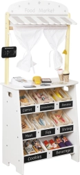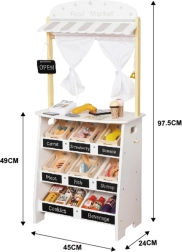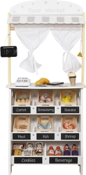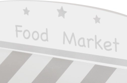 Lesen stoj z markizo in razdelki za živila ponuja otrokom avtentično izkušnjo nakupovanja: razvrščanje sadja in zelenjave, pisanje s kredo na tablice ter označevanje nakupov na blagajni s čitalnikom. Z obračanjem ali zapiranjem stranskih sten se spremeni v prikupno gledališče z zaveso – idealno za prve zgodbe in predstave.