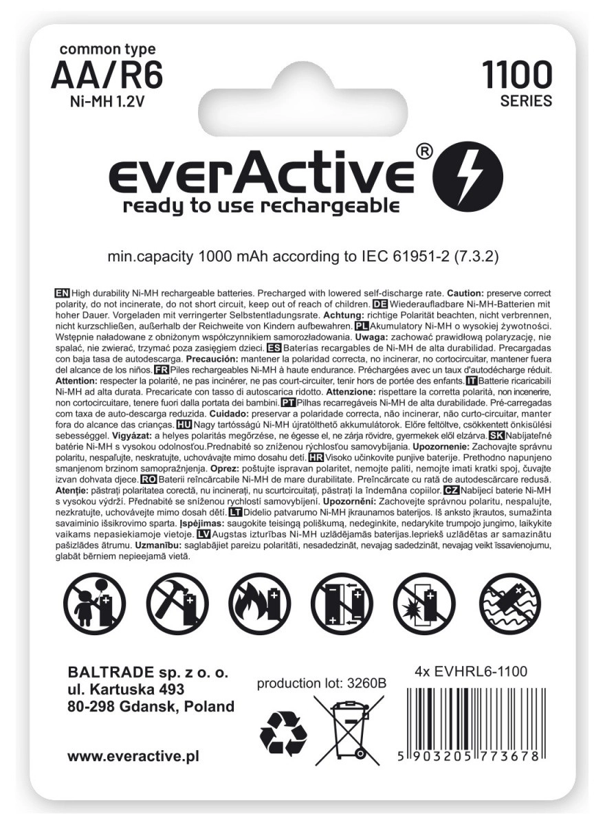 Odkrijte inovativne akumulatorje R6 AA 1100 mAh znamke EverActive, ki so del serije Infinity Line. Te polnilne baterije so razvite s tehnologijo "ready to use", kar pomeni, da so prednaložene in pripravljene za takojšnjo uporabo: