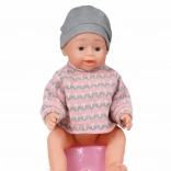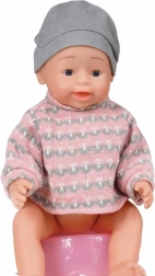 Napolni priloženo stekleničko, daj punčki piti in jo posedi na kahlico – po pritisku gumba nad popkom začne lulati. Odlična pomoč pri učenju higienskih navad.