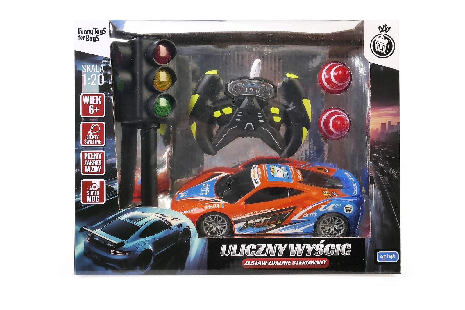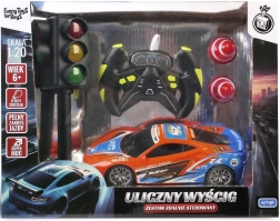 Dirkalni avto Street Racing Car je dinamična daljinsko vodena igrača, ki prinese pravo dirkaško vznemirjenje v tvoj dom! Set vsebuje avto, daljinski upravljalnik, semafor in dva stožca za ustvarjanje lastne proge.