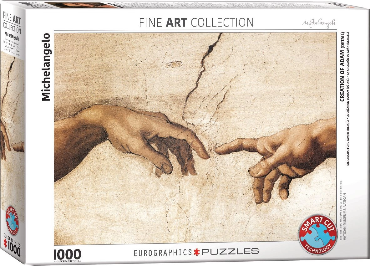 Uživajte v umetniški izkušnji s puzzle »Stvarjenje Adama – detajl slike« s 1000 koščki. Zahvaljujoč netipično oblikovanim koščkom podjetja EUROGRAPHICS ponuja ta puzzle višjo zahtevnost, natančno upodobitev detajlov slavnega dela in po sestavi dimenzije približno 67,63 × 48,89 cm.