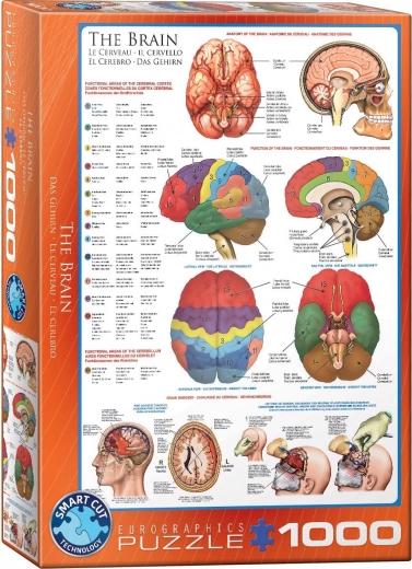 Odkrijte skrivnosti človeških možganov s tem izobraževalnim puzzlejem s 1000 kosi znamke EUROGRAPHICS. Puzzle prikazuje anatomijo človeških možganov, njihove funkcije in delovanje z označbami v štirih jezikih.