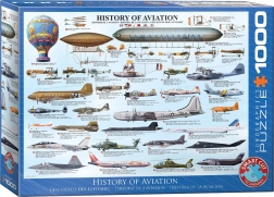 EUROGRAPHICS Puzzle Zgodovina letalstva ponuja osupljiv vpogled v svet letal, prikazuje razvoj od balonov in zračnih ladij do sodobnih letal, kot sta Boeing in Lockheed. S 1000 edinstvenimi koščki je izziv za vsakega ljubitelja zgodovine.