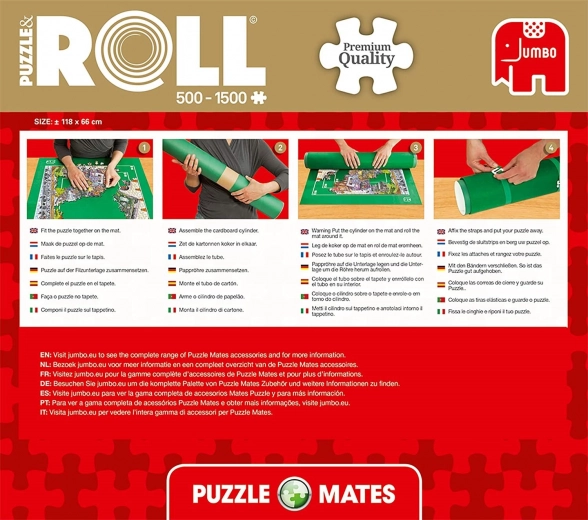 Praktična rolo podloga za sestavljanke JUMBO za 500–1500 kosov vam prihrani prostor in zagotovi varno shranjevanje razdelane ali dokončane slike. Podloga v velikosti 118 × 66 cm je primerna za sestavljanke do 110 × 60 cm in omogoča enostavno zvijanje in prenašanje s pomočjo čvrstih tulcev in gumijastih trakov.
