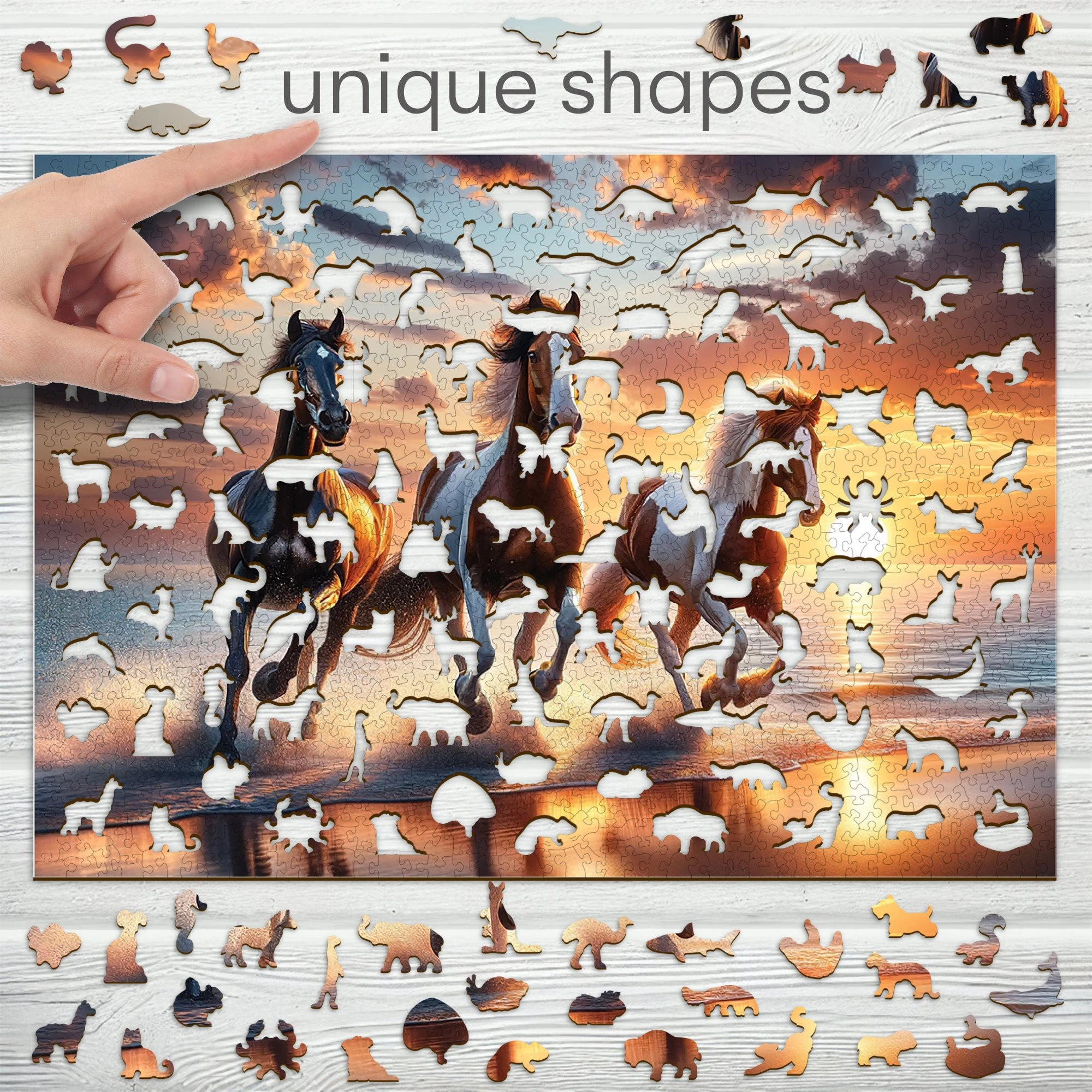 Vstopite v svet kakovostnih lesenih sestavljank z motivom divjih konj na plaži. WOODEN CITY prinaša lasersko izrezane koščke iz trde HDF plošče debeline 3–4 mm, ki se ponašajo z gladkimi robovi in dolgo življenjsko dobo. Del koščkov je v obliki živali in lahko zaradi drobnih detajlov služi tudi kot majhne figurice.