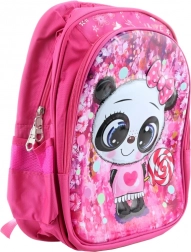 Nahrbtnik je okrašen z ljubko pando, ki ima pentljico in drži liziko, kar doda igrivost in privlačnost za majhne otroke.